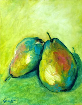 I painted these under our shady pergola on a sunny late-summer day. The fruit is from one of two espaliered Bartlett Pear trees we have. Each pear tree produces dozens of pears!
